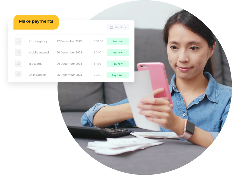We will make it easy for you to manage receipts and bills. All we need from you is to snap a photo of your on-the-go expenses, the rest will be handled by us. We will send you reminders of the bills coming due and schedule payments to help with bill-smoothing and cashflow.